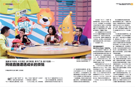 《中国经济周刊》2016年第44期《网络直播遭遇成长的烦恼》2016年被称作“直播元年”。对于大多数人来说,直播是一个隐秘难解的世界:有运营资本的大鳄,有追名逐利的直播平台和经纪公司,也有自嗨的草根民